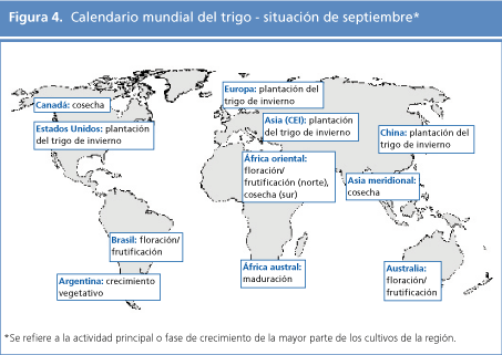 Los precios internacionales del trigo subieron ligeramente desde el comienzo de la campaña comercial de este año, con un promedio de 167 dólares EE.UU. por tonelada para el trigo N.2 (HRW, f.o.b.) en septiembre, 16 dólares más por tonelada desde mayo y 12 dólares EE.UU. más por tonelada que en el período correspondiente del año pasado. La fuerza manifestada en los precios del trigo duro procedente de los Estados Unidos se debió al ritmo más rápido de las ventas realizadas al principio de la campaña que indicaron una fuerte demanda de exportación para el trigo de los Estados Unidos, sostenida por los costos de transporte más bajos (disminución de los fletes marítimos para la carga seca a granel) y un dólar EE.UU. más débil. Mientras los precios del trigo duro se han mantenido al alza, los precios del trigo blando se mantuvieron bajo una presión a la baja a causa de la mayor competencia con la abundancia de suministros del trigo más barato (de alrededor de 95 dólar EE.UU. por tonelada) que llegaba a los mercados mundiales de la región del Mar Negro. En la UE, a pesar de la abundancia de suministros el ritmo de las ventas siguió siendo débil ya que el euro comenzó a recuperarse frente al dólar y el nivel de los reembolsos a las exportaciones (subvenciones) se mantuvo bajo, pese a un pequeño aumento en las últimas semanas de 4 a 6 euros. A finales de septiembre, los futuros de trigo para la entrega en diciembre en el Chicago Board of Trade (CBOT) se cotizaron en 120 dólares EE.UU. por tonelada, un poco más que en agosto y que en el período correspondiente del año pasado. Mirando hacia adelante, mientras se pronostica que el comercio se contraerá y ello podría significar una mayor presión a la baja sobre los precios, las perspectivas para una fuerte disminución de los suministros de exportación en la Argentina, la disminución de las ventas de la UE y una gradual reanudación de los niveles normales de exportación procedentes del Golfo de los Estados Unidos podrían mantener los precios por encima de los niveles del año anterior. ![]()