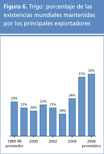 El pronóstico relativo a las existencias de trigo para las campañas agrícolas que terminan en 2006 se ha revisado al alza en 4 millones de toneladas a 163 millones de toneladas desde el informe anterior. En este nivel, las existencias mundiales de trigo se reducirían en alrededor de 10 millones de toneladas, o sea un 5 por ciento, respecto a su nivel inicial. La mayoría de las revisiones de este mes se deben a ajustes al alza a las estimaciones para la producción de trigo de este año en algunos países, incluidos algunos países exportadores de trigo. La disminución prevista en las reservas mundiales en la presente campaña se debe principalmente a ulteriores reducciones de las existencias en China así como en la India, Turquía, la República Árabe Siria y Marruecos. También se pronostica una disminución de las existencias finales en la UE con respecto a sus niveles excepcionalmente altos, como consecuencia de un descenso pronunciado de la producción de este año. En los Estados Unidos, se pronostica que las existencias de trigo aumentarán ya que las exportaciones pueden disminuir a causa del aumento de la competencia. Con respecto a los principales exportadores, como grupo, se pronostica ahora que las existencias totales de trigo se acercarán a los 52 millones de toneladas, 2 millones de toneladas más que en el informe anterior y ahora sólo ligeramente por debajo de los niveles iniciales. Según los pronósticos actuales, las existencias totales de trigo de los principales exportadores representan el 32 por ciento del total mundial, semejante a la proporción estimada en 2004/05 y todavía la más elevada en dos decenios. Además, las existencias totales de trigo de los principales exportadores como porcentaje de su desaparición total (utilización interna y exportaciones) se mantiene casi constante en alrededor del 21 por ciento, menos que en la campaña anterior pero cercana a su tendencia decenal.