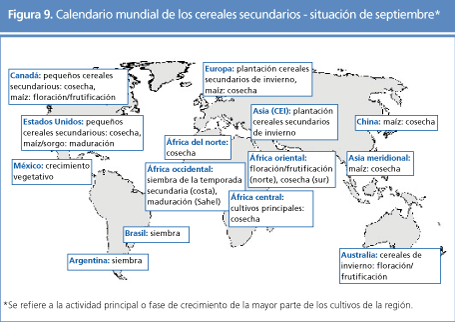 En América del Norte, las perspectivas para la producción de cereales en los Estados Unidos no se han visto alteradas apreciablemente por los efectos devastadores del huracán Katrina. Los daños a los cultivos se limitaron principalmente a la región septentrional del delta del Misisipí donde los principales cultivos son la caña de azúcar, el algodón y la soja. Más al norte, en la región oriental de la zona del maíz y del valle de Ohio, los cultivos se beneficiaron de una humedad adicional que llegó a esas zonas. Lo que afectó mucho más a la cosecha principal de maíz ha sido el tiempo caluroso y seco registrado en la parte central y meridional de la zona del maíz durante la mayor parte de junio, julio y principios de agosto, que ha perjudicado el potencial de rendimiento. A principios de septiembre, cuando recién comenzaba la cosecha de maíz en los estados productores del sur, sólo el 51 por ciento de la cosecha total se consideraba buena/excelente, en comparación con el 69 por ciento durante el mismo período del año pasado. Los estados más afectados han sido Illinois, Missouri y Texas, donde el 57 por ciento, el 43 por ciento y el 38 por ciento, respectivamente, de la cosecha se clasificaba como muy mala/mala. El pronóstico oficial más reciente prevé una producción total de maíz de alrededor de 270 millones de toneladas. Ello representaría una disminución del 10 por ciento con respecto de la cosecha récord del año pasado pero aún así la segunda cosecha mayor registrada hasta ahora, ya que, a pesar de la probabilidad de rendimientos inferiores a la media, este año se ha sembrado una superficie muy extensa. La producción total de cereales secundarios del país se pronostica en 288 millones de toneladas. En Canadá, ha comenzado la cosecha de cereales secundarios y aunque la campaña ha sido generalmente favorable, se prevé que la producción descenderá con respecto al nivel excelente del año pasado. El pronóstico más reciente de la producción total de cereales secundarios es de 25,3 millones de toneladas, en comparación con los 26,7 millones de toneladas obtenidas en 2004, pero todavía muy por encima de la media de los últimos cinco años. En Europa, en los dos últimos meses se ha visto un deterioro de las perspectivas para la cosecha de cereales secundarios de 2005, principalmente con respecto al maíz en los países meridionales, afectados por la sequía. Por consiguiente, el pronóstico relativo a la producción total de cereales secundarios de la región se ha revisado a la baja desde junio a 208 millones de toneladas, 13 por ciento menos que la producción sin precedentes del año pasado. En la UE las cosechas de cereales pequeños se han recogido mayormente en condiciones favorables, pero dado que tanto la superficie como el rendimiento han disminuido con respecto al año pasado se prevé una reducción apreciable de la producción del 15 por ciento en el caso de la cebada, el 19 para el centeno y el 11 por ciento para la avena. Además las intensas precipitaciones caídas en el verano en algunas partes, sobre todo Alemania, han reducido considerablemente la calidad de los cultivos de este año. Igual que el maíz, la mayor parte de la cosecha todavía tiene que recogerse. Durante el verano la sequía ha reducido los rendimientos de los principales cultivos de la región en Francia, Italia y España. Aunque la sequía ha sido muy devastadora en algunos países, particularmente la España y Portugal, en general sus efectos a nivel regional no han sido tan grandes como los de la sequía generalizada en 2003. En los países balcánicos, unas precipitaciones excesivas e inundaciones caracterizaron el verano, con un efecto negativo tanto en los rendimientos como en la calidad de los cereales secundarios pequeños (principalmente cebada). Sin embargo, tras las condiciones óptimas registradas en 2004 ya se preveía una disminución de la producción de este año. En Rumania, se estima que la producción de cebada será alrededor del 20 por ciento menos que la excelente cosecha del año pasado aunque todavía situada en torno a la media. Las precipitaciones recibidas en el verano fueron menos perjudiciales para la cosecha de maíz, que, según los pronósticos, alcanzará los 10 millones de toneladas, la segunda después de la cosecha récord del año pasado. En los países de la CEI europea, la recolección de los cereales secundarios de 2005 está muy avanzada y la producción total se estima en alrededor de 51 millones de toneladas, aproximadamente 4 millones de toneladas menos que el año pasado y por debajo de la media de los últimos cinco años. La merma se debe a los efectos combinados de una reducción de la superficie a causa del mal tiempo durante el período de siembra y a una disminución de los rendimientos con respecto a los altos niveles alcanzados el año pasado. De este total, se prevé que la cebada represente alrededor de 27 millones de toneladas y el maíz 9,7 millones de toneladas. En Oceanía, las perspectivas para la producción de cereales de invierno han sufrido una fuerte modificación en Australia desde el comienzo de la campaña cuando parecía que la sequía limitaría gravemente la siembra. Las buenas lluvias recibidas en torno a mediados de junio, justo a tiempo para permitir una aceleración de los trabajos de campo antes de que terminara el período de siembra. De hecho, se señala que la superficie sembrada, el principal cereal secundario de invierno, ha aumentado este año, ya que muchos agricultores prefirieron este cultivo que rinde relativamente más, aún cuando se planta en un período bastante tardío de la campaña. Por consiguiente, aún suponiendo un rendimiento moderado, un poco menos de la media quinquenal, el pronóstico oficial más reciente cifra la producción total de cebada en 6,6 millones de toneladas, alrededor de un 3 por ciento más que el año anterior. La siembra de la cosecha de sorgo d