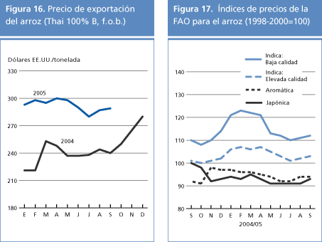 Los precios internacionales del arroz se debilitaron algo en junio y julio, como se refleja en el Índice de Precios de la FAO para todos los tipos de arroz (1998-2000=100), que perdió 1 punto en cada uno de los dos meses, descendiendo a 100 en julio, el valor más bajo del índice desde febrero de 2004. En agosto y septiembre, los precios cobraron algo de fuerza y el índice aumentó a 101 y 102, respectivamente, gracias especialmente a las cotizaciones mayores del arroz Indica (tanto de calidad inferior como de calidad superior) y del arroz Aromático. En cambio, el subíndice para el arroz Japónica se mantuvo en 93 entre julio y septiembre. La debilidad de los precios internacionales registrados en junio y julio se debió principalmente a la demanda lenta de importaciones y a los suministros relativamente abundantes que siguieron a las cosechas secundarias de 2004 en los principales países exportadores. También tendió a deprimir los precios la competencia renovada de la India y China. En agosto, sin embargo, el anuncio de un aumento de los precios de compra en Tailandia y la reanudación de los envíos a África y al Iraq imprimieron nuevo vigor al mercado. Los precios internacionales han continuado afirmándose en las primeras semanas de septiembre, gracias al retorno de Indonesia al mercado de importación, a las fuertes ventas destinadas al África y a los nuevos contratos de entregas al Iraq. La venta realizada por Tailandia en septiembre de 900 000 toneladas de arroz del gobierno a través de licitaciones se efectuó a precios relativamente altos y no deprimieron el mercado. El vigor de los precios debería continuar en los meses venideros, en parte por reacción al aumento de los costos de producción y mercadeo, que se han relacionado con el aumento de los precios del petróleo. También se prevé que los precios reaccionen fuertemente a las novedades relativas a las cosechas y a las políticas gubernamentales.