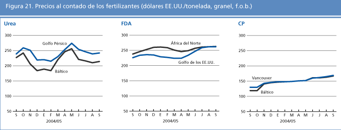 Durante los últimos meses los precios de la urea se han mantenido estables. En comparación con el año pasado, son un poco más bajos en la región del Báltico y más altos en el Golfo Pérsico. La producción de urea y de amoníaco en los Estados Unidos se ha visto perjudicada en el período posterior al huracán Katrina a causa de las interrupciones en el suministro y ulteriores aumentos de los precios del gas natural. Los precios del gas ya eran altos antes del huracán, porque un 88 por ciento de la producción en ultramar había cerrado. Los precios tanto de la urea como del amoníaco han subido en los Estados Unidos, mientras que en los últimos meses los precios del amoníaco han subido en todo el mundo. En la región del Báltico y del Mar Negro los precios han comenzado a bajar un poco y la actividad es lenta. En el Asia meridional la demanda de urea es fuerte. En la India es mayor de lo previsto a causa a una temporada monzónica buena. Según los informes, Bangladesh está licitando una cantidad considerable de Indonesia y China, y también el Pakistán está empeñada activamente en la búsqueda de licitaciones. Turquía ha cerrado su planta de urea debido a los altos precios del gas y sus importaciones de urea podrían aumentar sensiblemente.