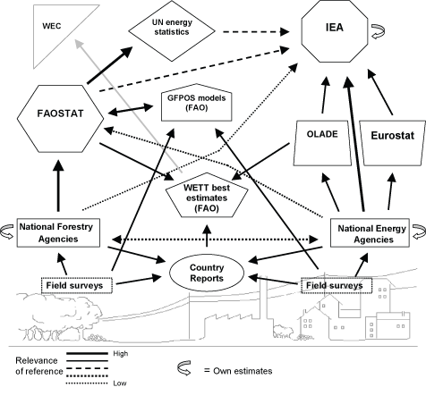 The flow of information that feeds the primary sources is extremely complex, as is shown, tentatively, in Figure 1. Wood energy statistics originate from two sectors: the forestry sector, shown on the left side of the figure; and the energy sector, shown on the right. The level of integration between the perspectives of these two different sectors is still quite low, which explains some of the main discrepancies between data sources.