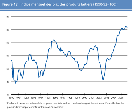 L'indice FAO des cours internationaux des produits laitiers (1990-92=100) s'est stabilisé dans la fourchette 160-165 en 2005, pour atteindre en septembre son plus haut niveau depuis 15 ans, à savoir 165, fléchissant légèrement et repassant à 163 en novembre. Selon les prévisions, à la fin de l'année, la valeur moyenne de l'indice des prix en 2005 s'établira à 162, contre 145 l'année précédente. Les prix sont demeurés élevés, principalement du fait d'une croissance plus forte de la demande en certains endroits de l'Asie du Sud-Est et de l'Afrique du Nord, mais aussi en raison des disponibilités limitées en Océanie et des moindres subventions à l'exportation accordées par l'Union européenne. S'agissant des différents types de produits laitiers, les prix à l'exportation du beurre et du lait entier en poudre en provenance de l'Océanie étaient en hausse d'environ 3 pour cent en novembre, tandis que ceux du fromage (Cheddar) dépassaient de près de 5 pour cent ceux enregistrés à la même époque un an auparavant. Si l'on convertit les prix du blé et du lait écrémé en poudre de l'Océanie en un prix équivalent lait et si l'on tient compte d'une marge de 15 pour cent pour la transformation, les prix mondiaux du lait (base Océanie) à la production se situent à environ 0,23 dollar EU le kilo, soit bien plus que leur valeur tendancielle, qui avoisine 0,19 dollar EU le kilo. Il est donc probable que la production augmentera, ce qui au bout du compte devrait ramener les prix à un niveau proche de leur valeur tendancielle. De toute évidence, il a été démontré dans le passé que les prix des produits laitiers sont très fluctuants par rapport à la tendance; il s'agit de savoir quand les prix du lait accuseront un recul, et dans quelle proportion.