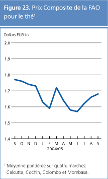 Le prix composite de la FAO pour le thé a atteint 1,68 dollar EU le kilo en septembre 2005, en hausse de 1,5 pour cent par rapport au mois d'août, la demande saisonnière ayant fait monter les prix sur la plupart des marchés aux enchères. Les prix aux enchères à Colombo ont gagné 8 pour cent par rapport à septembre, tandis qu'à Mombasa et à Cochin, les prix ont augmenté respectivement de 2 pour cent et 4,7 pour cent. Seul le marché de Kolkata a enregistré un recul significatif, les prix reculant en moyenne de 7,5 pour cent tandis que la récolte battait son plein. Une analyse des tendances passées sur le marché aux enchères de Kolkata indique un recul global de 9,5 pour cent en moyenne entre août et septembre.