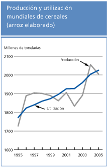 NOTICIAS MÁS IMPORTANTESEl pronóstico más reciente de la FAO relativo a la producción mundial de cereales de 2005 se ha aumentado considerablemente desde el informe de septiembre a 2 005 millones de toneladas, un 2,4 por ciento más que la cosecha sin precedente del año pasado. Salvo en algunas partes de África y América del Sur, en la mayoría de las regiones las cosechas de cereales han sido satisfactorias. En las principales regiones productoras se ha comenzado a sembrar la cosecha de cereales de 2006 en condiciones generalmente favorables hasta ahora. Pero en el África austral y América del Sur las perspectivas son inciertas. Se pronostica un aumento de la utilización mundial de cereales en 2005/06, ya que el crecimiento previsto en el consumo humano dará lugar a un cierto incremento del consumo por habitante en los países en desarrollo. En cambio, es probable que disminuya la utilización de cereales para pienso. Se prevé una disminución de las existencias mundiales de cereales, debida principalmente a una reducción del inventario de los cereales secundarios resultante de la merma de la producción de este año. El comercio de los cereales debería contraerse en 2005/06 tras una producción mejorada obtenida en los principales países importadores, principalmente en Asia. En general, los precios internacionales de los cereales son más altos que hace un año. En la Argentina, los precios de exportación han aumentado de forma pronunciada debido a una merma de la producción de trigo; también en Sudáfrica, como consecuencia de la gran demanda regional de maíz. Se prevé un crecimiento de la producción mundial de leche en 2005, pero siguen escaseando los suministros de los exportadores habituales. Los precios del comercio internacional se han estabilizado a niveles altos, sostenidos por la fuerte demanda registrada particularmente en Asia y África del Norte. Los precios internacionales de las semillas oleaginosas se han debilitado en los últimos meses a raíz del considerable aumento de la producción experimentado en 2004/05 (octubre/septiembre), que ha elevado las existencias remanentes de semillas oleaginosas hasta niveles sin precedentes. Se pronostica un aumento de la producción mundial de azúcar en 2005, pero es probable que una demanda sostenida en los países en desarrollo mantenga restringida la oferta mundial. Los precios internacionales del azúcar se mantienen firmes. Los precios internacionales de los bananos han aumentado como consecuencia del mal tiempo registrado en América Latina. A fines de noviembre, la UE aprobó un sistema de arancel único que entrará en vigor a partir de enero de 2006. La eventualidad de una difusión generalizada de la gripe aviar podría alterar gravemente los mercados mundiales de productos avícolas y forrajeros.