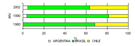 La participación porcentual de los países integrantes de la subregión del Cono Sur en las importaciones históricas de papel y cartón pueden verse en la figura 35. Como se puede observar Chile fue el único país que presentó un aumento significativo en la distribución de las importaciones de papel y cartón en la subregión entre 1980 y 2002. Para la mayoría de los países sus participaciones han permanecido prácticamente equivalentes a las del período anterior y la Argentina ha disminuido drásticamente.