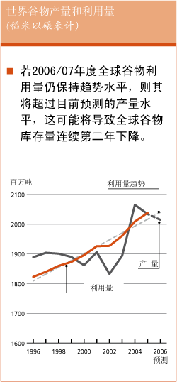 预测2006年世界谷物产量将比去年的丰产水平略有下降。预计小麦产量将减少,原因是美国和欧洲独联体国家收成因天气条件不利而减产。初步预测粗粮产量将下降,主要原因是预计美国播种面积减少。由于初期前景看好,稻米产量可能增加。