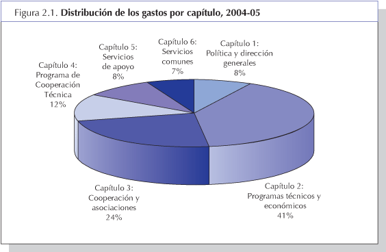 Evolución de los recursos totales16. En el cuadro 1 se presentan los gastos realizados en 2004-05, según se expone en las cuentas financieras del bienio, por fuentes de fondos, bajo las categorías contables de “Fondo General y fondos conexos” y “Fondos fiduciarios y Programa de las Naciones Unidas para el Desarrollo (PNUD)”: