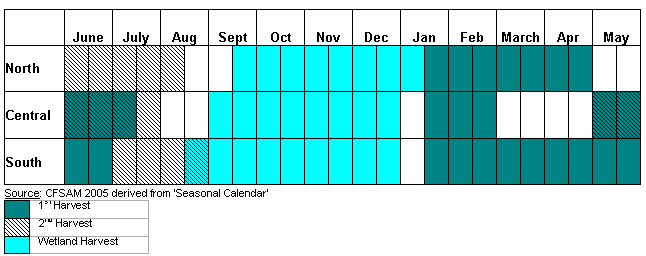 Crop production is based on a rainfed main growing season from September to May (planting may vary from September to February). In the north and centre however, rainfall shows a distinct bimodality with a dry spell between mid-December and mid-January, thus giving it two effective planting seasons. The period between September and May accounts for about 95 percent of the total production of cereals and pulses, which are also the major food crops: maize, sorghum, millet, rice, beans, groundnuts, cassava, sweet potatoes and Irish potatoes. A subsidiary growing season occurs between June and August when low-lying wetland areas (‘nacas’ or ‘baixas’) are planted mainly with vegetables such as cabbages, tomatoes, lettuce, onions, peppers, carrots, pumpkins, sweet potatoes, cereals and pulses. This season usually accounts for about 5 percent of the country’s production of cereals and pulses.