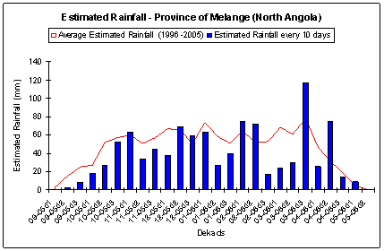 In the north, rainfall is normally bimodal, with a dry spell occurring between mid- to late December and mid- to late January. This year the rains started as usual in September but stopped slightly earlier than expected near the beginning of December. In most of the north, the rains started again in January within a week or so of the expected date but generally stopped slightly earlier than usual. The north of the country may therefore be considered to have had a relatively normal rainfall pattern this year. Since data on the ground level rainfall estimates was not available to the Mission, estimated rainfall pattern for the season as compared to the long-term average is shown in Figure1.