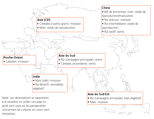 La récolte du blé d'hiver de la campagne principale et du riz de la première campagne de 2006 est terminée; la préparation des terres et les semis du riz et des céréales secondaires de la campagne principale ont commencé, les pluies de mousson ayant démarré en temps voulu. Dans les pays situés le long de la ceinture équatoriale, la campagne principale de riz est bien avancée. En Chine (continentale), la production de blé d'hiver de 2006 est estimée à 95 millions de tonnes, soit quelque 2,8 millions de tonnes de plus que la bonne récolte de l'an dernier et le meilleur résultat de ces cinq dernières années, principalement du fait des bonnes conditions météorologiques qui ont régné dans les principales régions productrices. Les semis de céréales secondaires (maïs principalement) de la campagne 2006 sont terminés dans les principales régions productrices; les réserves d'humidité des sols seraient généralement favorables à la germination, sauf dans quelques endroits. Du fait de la reprise continue de la production ces trois dernières années, les importations céréalières de la Chine en 2006/07 devraient se maintenir au niveau relativement bas de l'année précédente.