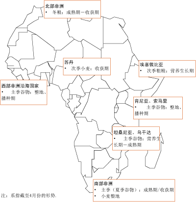 整个次区域2006/07次季谷物作物的收获工作基本结束,埃塞俄比亚除外,该国2007年次季作物将于6月开始收获。在埃塞俄比亚,由于早期到来的阵雨有助于整地备播,次季作物的前景总体看好。在肯尼亚,占全年产量20%的2006/07次季“短雨季”谷物作物的收获工作已经完成。去年10月至2007年1月初的丰沛降雨有助于单产的提高。本季作物是中央省和东部省部分地区粮食的主要来源。在索马里,预测近期收获的次季谷物作物的产量约为11.1万吨,为去年歉收水平高近三倍,比战后平均水平高13%,原因是本季节期间降雨情况改善。在苏丹,小麦作物的收获工作刚刚开始,预测产量为64.2万吨,比去年高55%。在坦桑尼亚联合国共和国,由于降雨丰沛,单峰雨区(该国中部、南部和西部地区,包括玉米产量盈余的西南部高地)将于5月开始收获的2007年主季粗粮作物的前景看好。在该国北部沿海和东北部的双峰雨区,2006/07年度短雨季作物的收获工作基本结束。预计由于生长季节降雨有利而将获得好收成。在乌干达,2006/07年度第二季谷物作物的收获工作已经结束。尽管特大暴雨影响了12月和2007年1月初的收获工作,但估计产量高于平均水平。