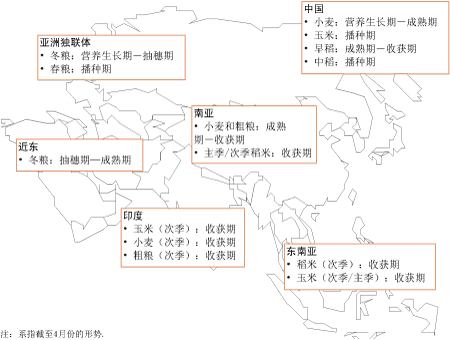 在阿富汗,全国降水和山地积雪数量高于平均水平,部分补充了该国不断下沉的水位并提供了良好的土壤墒情。去年的干旱对作物和家畜造成了重大破坏,北部有部分人口背井离乡外出寻找食物和水源。初步预测今年谷物产量约为490万吨,比去年因干旱减产的收成高近100万吨。但在伊拉克,卫星图像显示11月至2月期间农业气象条件不佳,过于干旱,不利于作物生长。由于冲突和流离失所不断,该国粮食安全形势仍极为脆弱。近期发展说明由于流离失所者增加,人道主义需求也增加。联合国及其它国际机构正在对局势进行监测并在必要时提供援助。约旦河西岸和加沙地带粮食形势也令人十分担忧。
