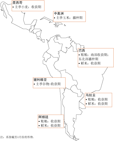 在墨西哥及中美洲和加勒比其它国家,预计2007年主季粗粮和稻米作物的播种工作将于5月初随着第一次季节性降雨的到来而展开。粗略预测该次区域2007年播种总面积为平均水平,包括930万公顷玉米,200万公顷高粱和71万公顷稻米。预计2007年谷物总产非常高,为3840万吨。在墨西哥,尽管2006年玉米收成不错,但预计2006/07销售年度(7月/6月)的商业进口量将达创纪录的800万吨的水平,以便大量补充供给和抑制白玉米和“玉米圆饼”的国内价格,这两种产品的价格已达到过去十年来的最高水平。