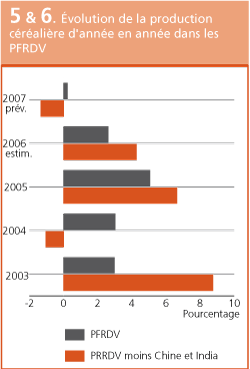 Après quatre ans de croissance soutenue, la production céréalière de 2007 des PFRDV ne devrait progresser que marginalement par rapport à 2006, ce qui fait que les disponibilités seront moins abondantes pour la nouvelle campagne 2007/08. Non compris la Chine et l'Inde, qui assurent les deux tiers environ de la production céréalière totale, les résultats du reste des PFRDV devraient accuser un recul de 1,3 pour cent après deux années consécutives de croissance considérable. Dans les PFRDV d'Afrique australe et d'Afrique du Nord, les récoltes céréalières s'annoncent inférieures au volume de l'an dernier, tandis que dans d'autres régions où les nouvelles campagnes agricoles viennent à peine de commencer, la production devrait reculer par rapport aux résultats exceptionnels de l'an dernier. Associé à la croissance démographique, cette situation poussera probablement plusieurs PFRDV à accroître leurs importations pour couvrir leurs besoins de consommation.