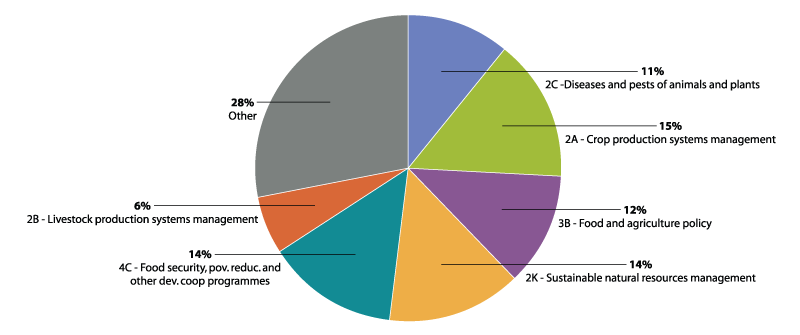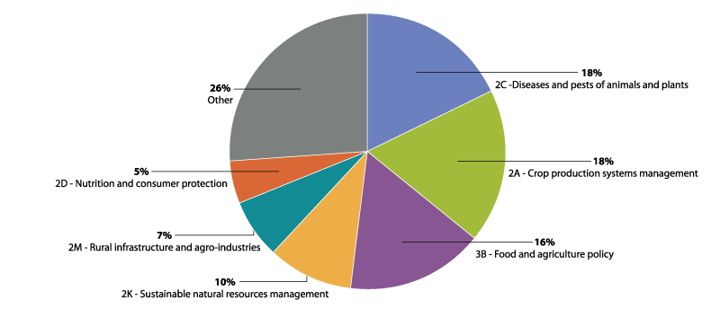 262. TCP assistance focused on Programme 3B: Food and agriculture policy, with 16% of regional project resources; followed by Programme 2C: Diseases and pests of animals and plants, 15%; and Programme 4C: Food security, poverty reduction, and other development cooperation programmes, 11%.