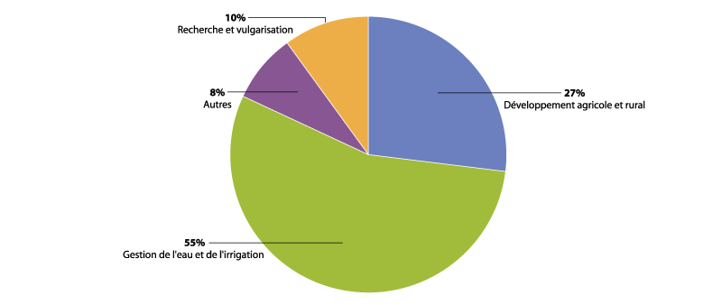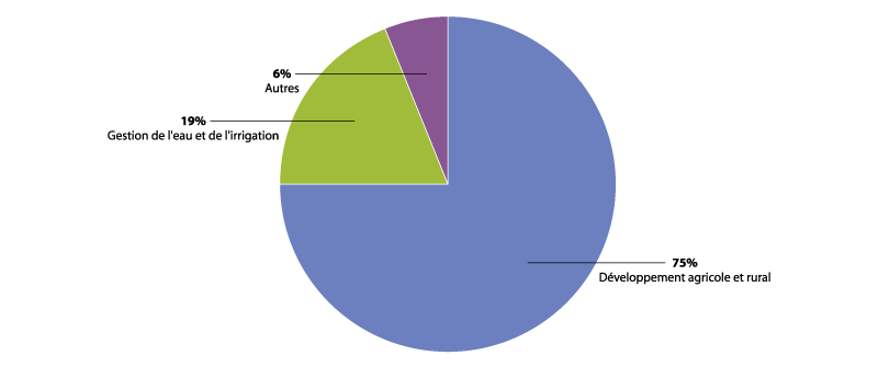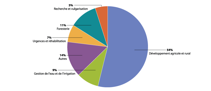 273. Les investissements dans l’agriculture et le développement rural ont représenté 43 pour cent des financements extérieurs au Proche-Orient et en Afrique, proportion comparable à celle enregistrée dans la plupart des autres régions. Toutefois, la région du Proche-Orient et de l’Afrique du Nord est la seule où les catégories énumérées ci-après ont été jugées les plus importantes: l'environnement et les ressources naturelles avec 16 pour cent, et les secours d'urgence et le redressement avec 15 pour cent.