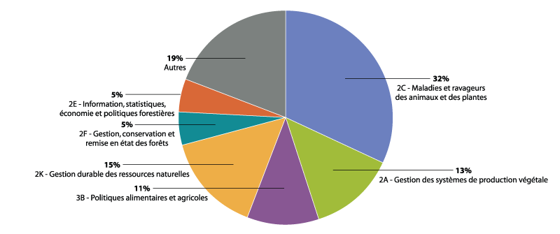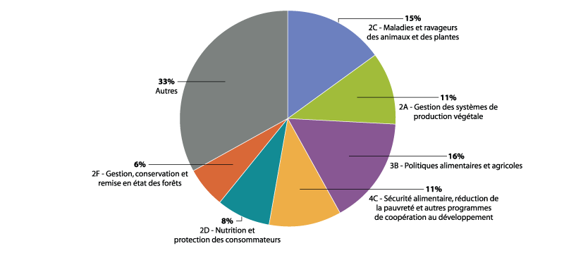 262. L’aide au titre du PCT s’est concentrée sur le Programme 3B: politiques alimentaires et agricoles, avec 16 pour cent des ressources régionales des projets; suivi par le Programme 2C: maladies et ravageurs des animaux et des plantes, 15 pour cent; et le Programme 4C: sécurité alimentaire, réduction de la pauvreté, et autres programmes de coopération au développement, 11 pour cent.
