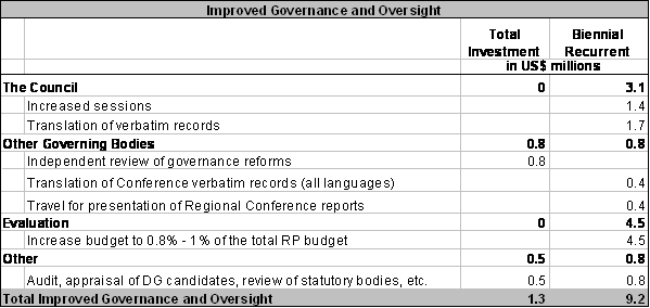 5) Table 1 shows the costs for improved governance and oversight. While investment costs are not particularly high (USD 1.3 million), the recurrent biennial costs are quite substantial at USD 9.2 million per biennium. Under governance, the large increases occur for the Council, where additional sessions and translation of verbatim records increase costs by USD 3.1 million. The other large increase in this category is a result of the importance given to Evaluation, where bringing the budget to at least 0.8% of the Regular Programme budget results in a biennial increase of USD 4.5 million.