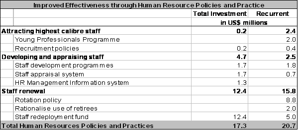 6) Table 2 provides an overview of the largest single cost category in the IPA, which is dedicated to increase effectiveness through improved human resource policies and practices. The actions are grouped into three categories: attracting the highest calibre staff, developing and appraising staff, and staff renewal. The single largest recurrent cost in these categories is the implementation of a rotation policy, which, assuming 80 rotations per year, would result in USD 8.8 million in recurrent costs per biennium.