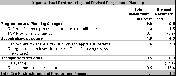 8) While the total costs related to organizational restructuring and revised programme planning (table 3) are relatively small (USD 4.1 million investment and USD 4.6 million recurring costs), the changes underlying these items are very large. For example, the headquarters’ structure changes will result in a significantly streamlined and downsized management structure with the related savings reinvested in the technical programmes (USD 17.4 million). The planning changes will allow for improved resource mobilization and provide a basis for more effective programme evaluation. The TCP programme changes, once fully implemented, will result in efficiency savings (USD 0.9 million per biennium).