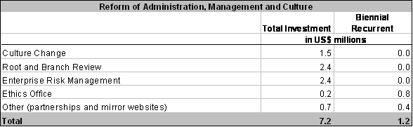 9) The items in Table 4 related to the reform of administration, management and culture entail relatively large investment costs (USD 7.2 million), but are expected to result in significant improvements in the ways of working.