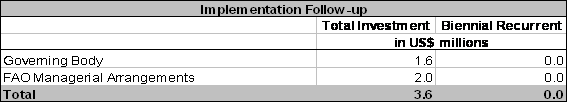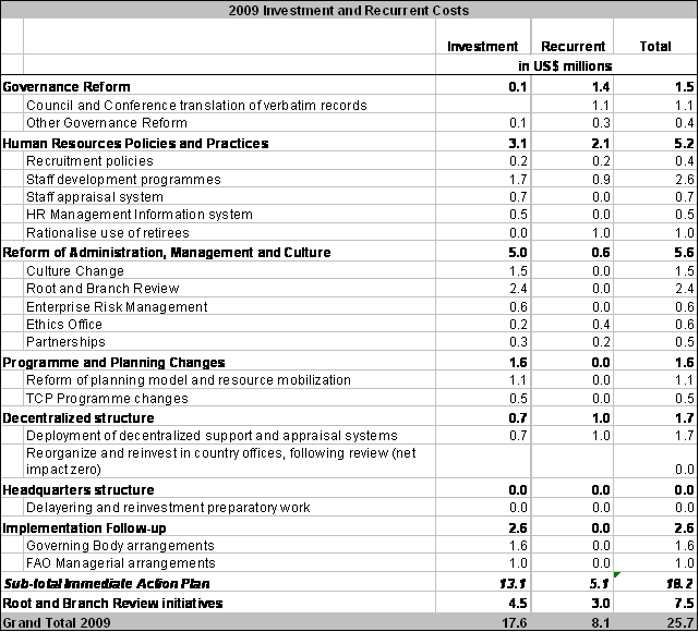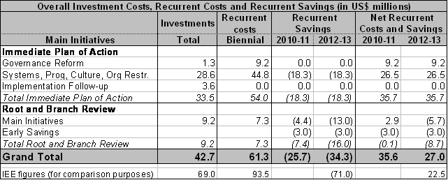 12) Table 6 provides an overview of the cost and savings estimates stemming from the Root and Branch Review. Total investment and recurring costs are estimated at approximately USD 16.5 million (with USD 9.2 in investment costs and USD 7.3 million in biennial recurrent costs).