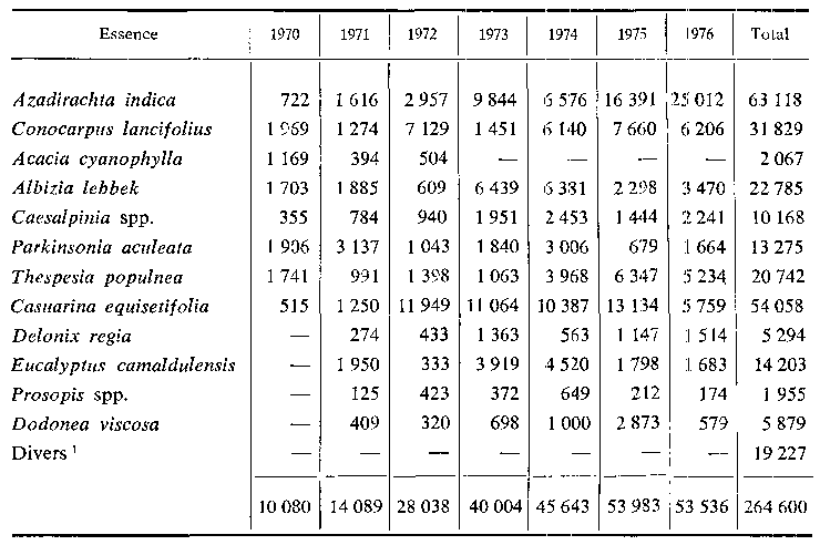 Une nouvelle période commence en août 1968 avec la création d'une section forestière au sein de la station de recherche agronomique. Cette section s'est depuis lors activement développée et a jeté les bases d'une véritable action forestière. Elle est maintenant dirigée par une équipe de forestiers nationaux et internationaux hautement qualifiés. L'introduction, la multiplication et la plantation d'essences exotiques sont réalisées à grande échelle, principalement sur terrain irrigué, pour former des brise-vent et des bordures routières, fixer les dunes, reboiser et créer des ceintures de protection et d'ornement des centres sociaux et économiques dans tout le pays. La section forestière tient un compte régulier de ses diverses activités. De nombreux rapports sont publiés par la FAO et on dispose maintenant d'une abondante documentation dans ce domaine.