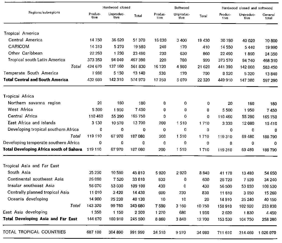 Table 1. Estimated areas of natural forests at end of 1975 (Thousand hectares)