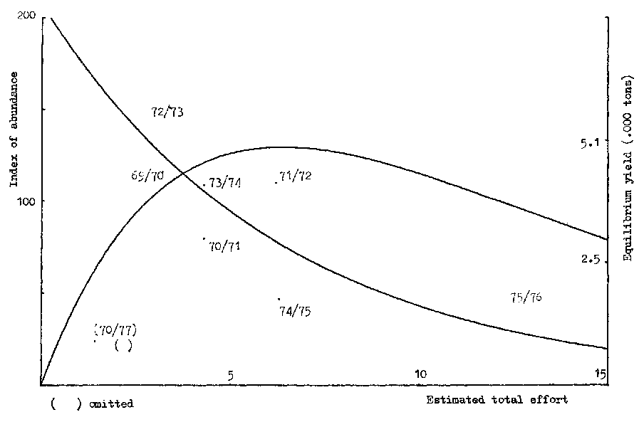 Octopus (O. vulgaris) 1Figures 4 and 5 - Octopus and cuttlefishes all grounds north of Cape Verde: relationship between the index of abundance and the total estimated effort, resulting equilibrium yield curve and levels of catch quota generating F0.1 and Fmax.