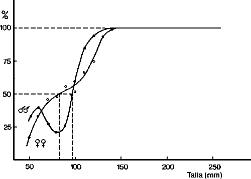 Las curvas de selectividad obtenidas son irregulares, observándose que en varias tallas pequeñas el tanto por ciento de retención es mayor que en clases superiores, fenómeno especialmente acusado en los machos (figura 3). Este tipo de irregularidad puede deberse a la escasez de datos (203 pulpos en el copo y 63 en el sobrecopo), aunque otras veces se presentan pese a la abundancia de los mismos (Larrañeta et al., 1969).
