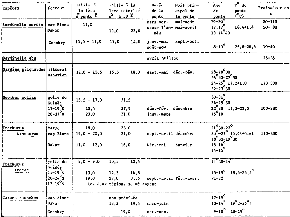 Les résultats concernant la proportion des femelles mures sont présentes au Tableau 1 et compares à ceux obtenus pour Sardina pilchardus et pour Trachurus spp. Dans le Tableau 2 sont résumées les conditions générales de la reproduction des principales espèces de poissons pélagiques côtiers dans l'Atlantique Centre-Est.