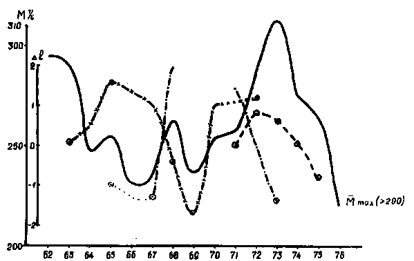 Fig. 5 - Changement de lintensité de lupwelling dannée en année (M-moyenne pour janvier-mars) et celui des tailles à lâge dun an des sardines (ls), du dente à gros yeux (D ld) et du pagre argenté (D lp)s