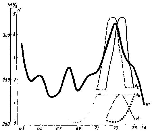 Fig. 8 - Effectifs (milliards dexemplaires) du premier (N1), du deuxième (N2) et du quatrième (N4) groupes dâge de la sardine, intensité de lupwelling (M) au cours de la première année de vie