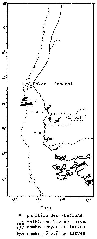 Fig. 1 - Répartition des larves de Sardinella aurita dans la zone sénégalo-mauritantenne, en mars
