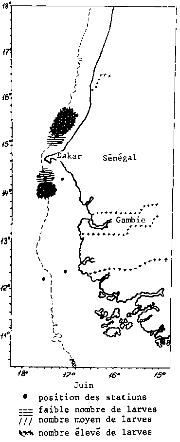 Fig. 2 - Répartition des larves de Sardinella aurita dans la zone sénégalo-mauritanienne, en juin