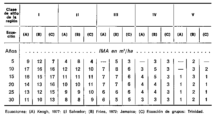 Se observaron mayores diferencias generales del incremento medio anual (IMA) en la clase de sitios I y en las clases de edad menor de todas las clases. La mayor diferencia global se observó en la clase de sitios I a los 5 años, en la que la ecuación (C) produjo un IMA de 7 m³/ha/año, es decir alrededor de 5 m³/ha/año menos que la ecuación (B). Las diferencias mínimas se observaron en las clases II, III y IV y en los años 15, 25 y 30 respectivamente.