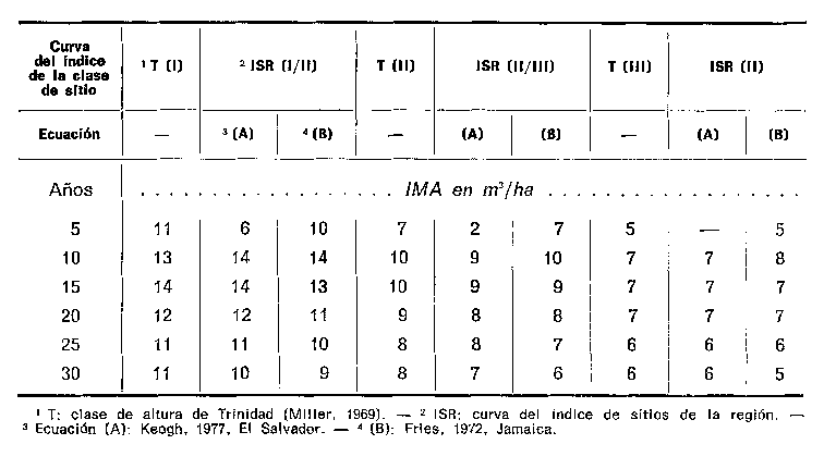 El Cuadro 3 revela en general que hay algunas semejanzas en las tasas de crecimiento del IMA entre países dentro de la clase. Basándose en este hecho y tomando en consideración las precauciones esbozadas en el estudio de Keogh (1979b), se hizo otra comparación, pero limitándose a ciertas curvas del índice de los sitios de las clases II y III y ampliándolas para abarcar una comparación con los resultados de Trinidad de Miller (1969). Las curvas del índice de los sitios se escogieron en el gráfico de clasificación de los sitios de la región fundándose en la semejanza de su IMA con el IMA de las clases de altura I, II y III de Trinidad. Cabe señalar que el 70% de los 144 puntos originales se encuentra entre las curvas exteriores de las clases II y III de la región. Las comparaciones aparecen en el Cuadro 4. La definición de volumen de Miller es: «sin corteza hasta un diámetro de 8 cm en la punta». El IMA en El Salvador y Jamaica acusa tendencias semejantes al de Trinidad, a pesar de que las plantaciones no se han sometido a ningún tratamiento silvícola determinado.