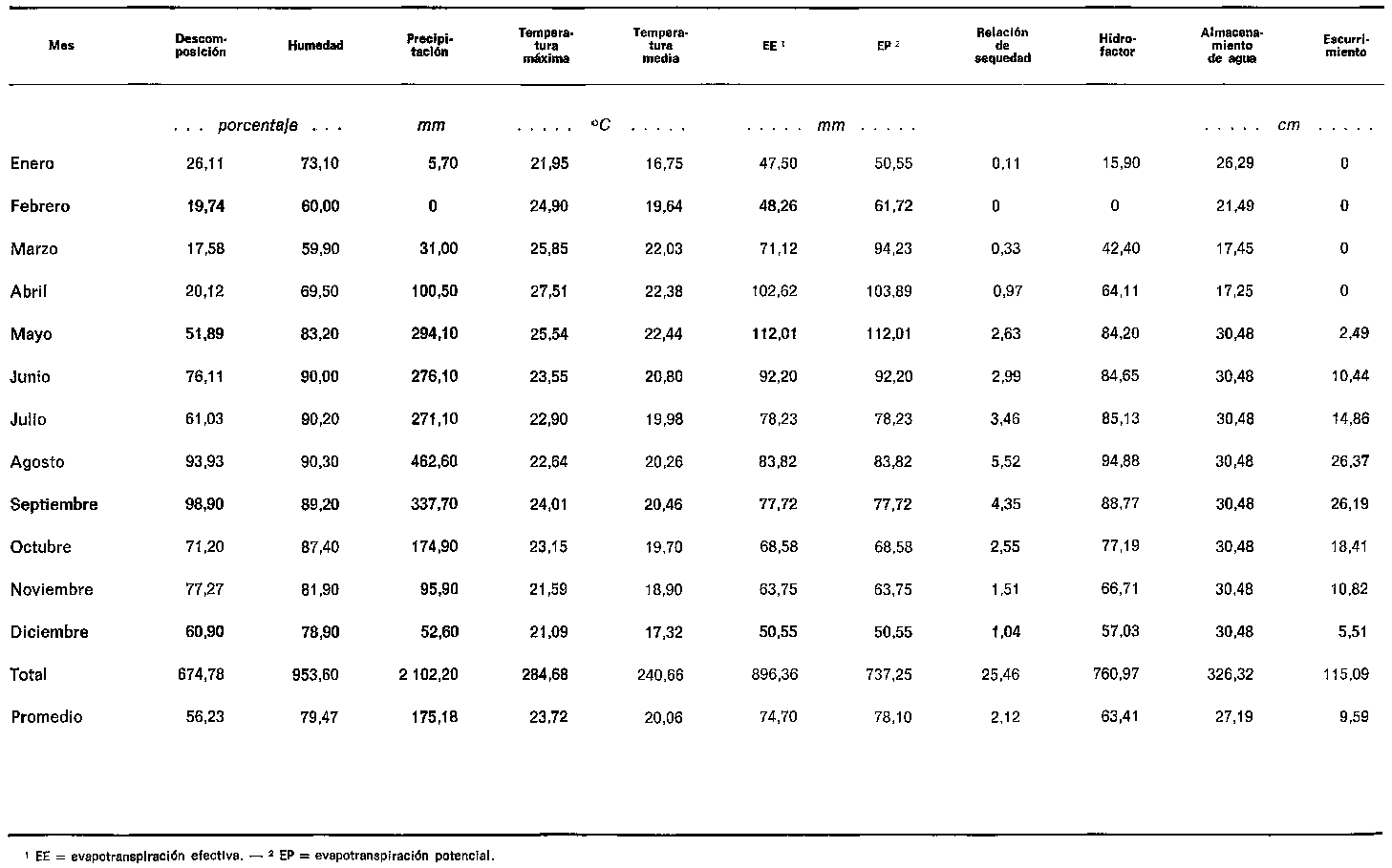 Cuadro 1. Descomposición mensual y algunas componentes del clima y del balance del agua del bosque perenne montano (Chiang Mai, Tailandia, 1968-1972)
