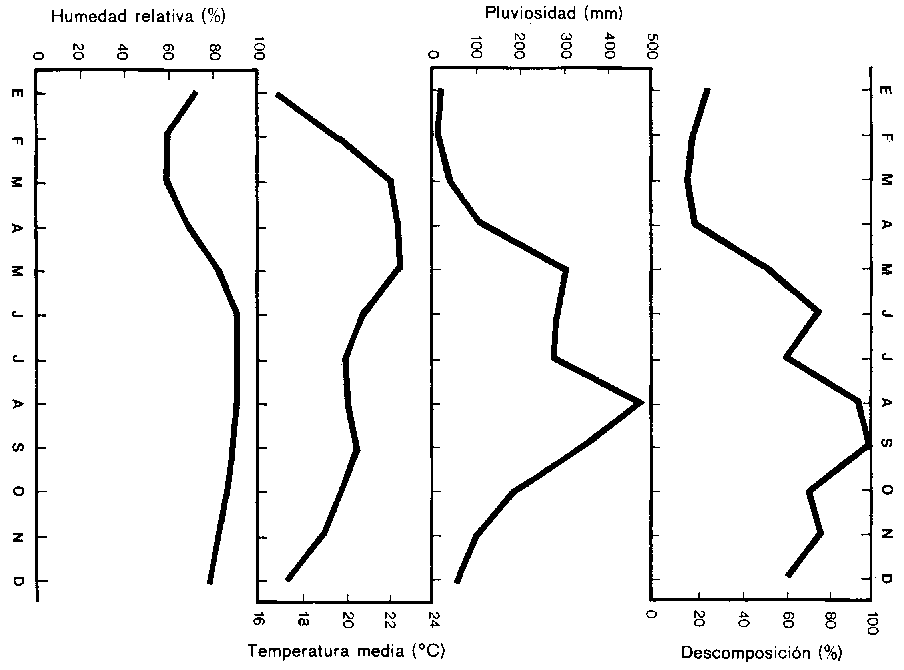Los datos climáticos originales y derivados y la descomposición mensual de la hojarasca del bosque perenne montano aparecen en el Cuadro 1. Los datos climáticos primarios son: humedad relativa, precipitación, temperatura máxima y temperatura media. Se observó que el porcentaje de descomposición aumenta con la precipitación y con la humedad. Con la temperatura sucede lo contrario. En la figura puede observarse que la descomposición sigue de cerca la intensidad de la precipitación, con un rezago de alrededor de un mes: por ejemplo, la primera cumbre de la descomposición se encuentra en junio y la primera cumbre de la precipitación en mayo. La segunda cumbre de la descomposición y de la precipitación se encuentran en septiembre y en agosto, respectivamente.