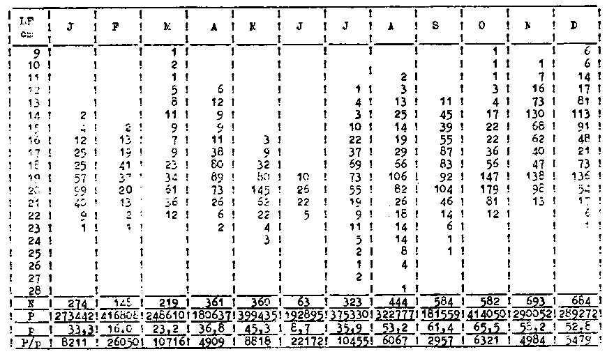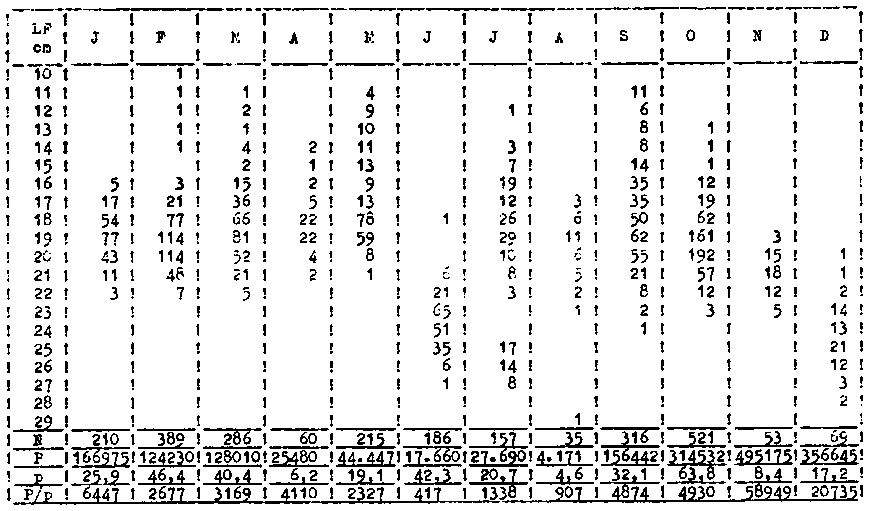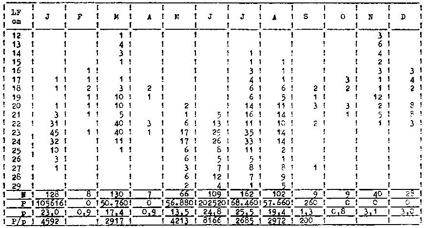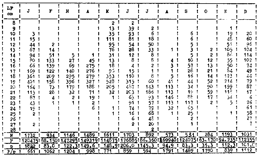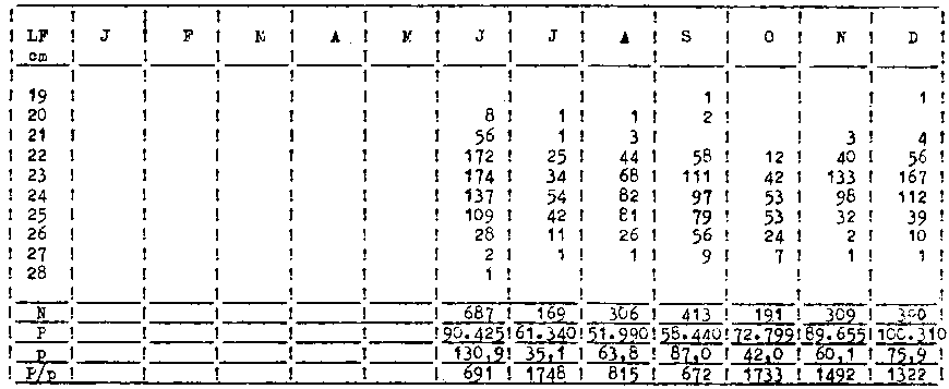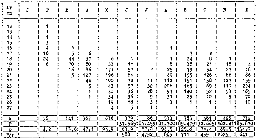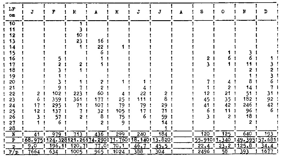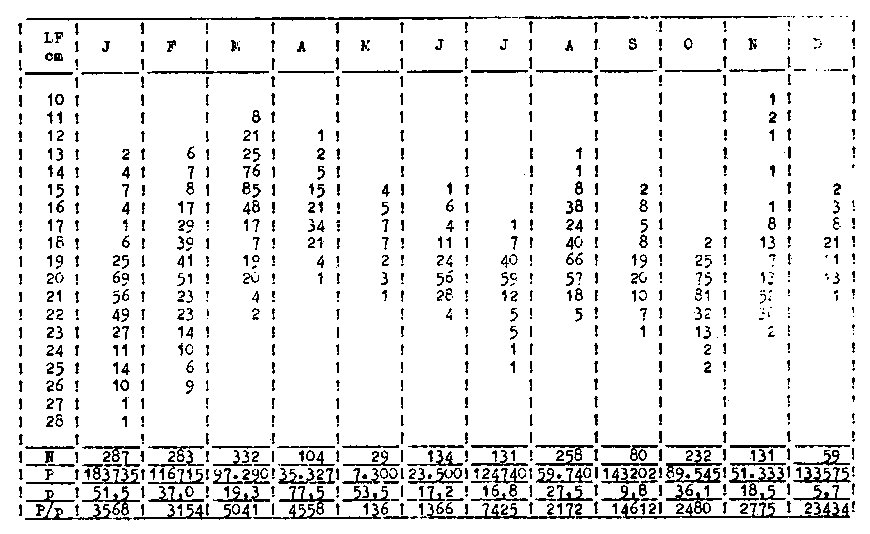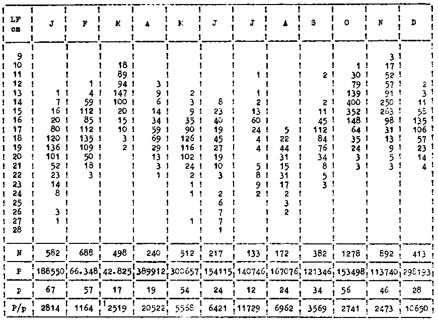 N = number of fish measured each monthSources:P = monthly landings in tonnes, by the boats of the major industrialized company, where sampling took place
