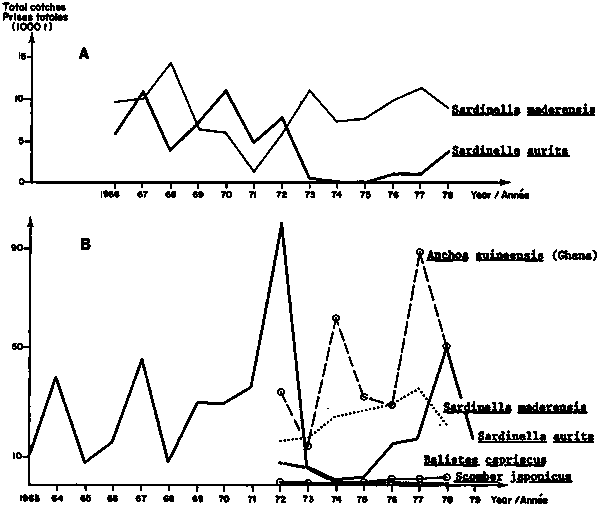 Figure 3 Annual catches of Sardinella aurita and other species caught by the pelagic fisheries in Ivory Coast (A) and the whole region (B) (1979 catches estimated) - Prises annuelles de Sardinella aurita et des autres espèces capturées par les pêches pélagiques de Côte d'Ivoire (A) et de l'ensemble de la région (B) (Prises estimées pour 1979)