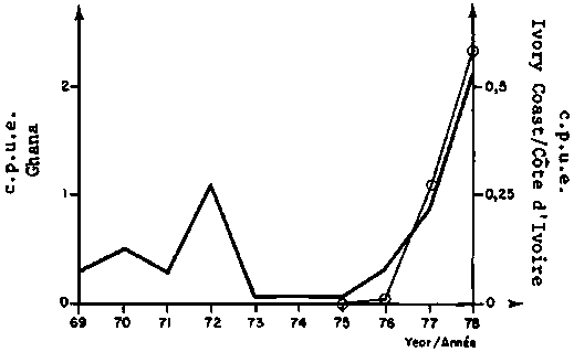 Ivory Coast: Sampling data from seiners extrapolated to the total catch figure for 1978; unweighted sampling data from trawlers (1978) and seiners (1979)Ghana: données brutes d'échantillonnage