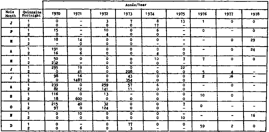 MEAN ANNUAL DISPLACEMENT VOLUMES OF ZOOPLANKTON OFF TEMA IN ml/1 000 m3 (AND MEAN VOLUME DURING THE UPWELLING SEASON - JULY/SEPTEMBER) (MENSAH, pers. comm.) AND ABUNDANCE OF ZOOPLANKTON OFF ABIDJAN AND ABUNDANCE OF CALANOIDES CARINATUS (BINET IN ORSTOM, 1976)