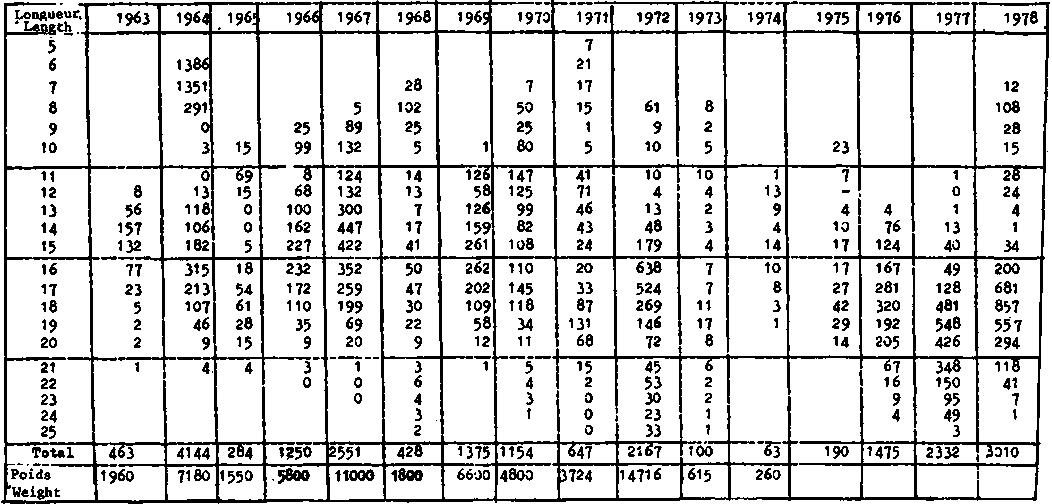ANNUAL LENGTH FREQUENCY DISTRIBUTION OF S. AURITA IN CATCHES OF GHANAIAN PURSE SEINERS FROM 1963 TO 1974: NUMBER OF INDIVIDUALS CAUGHT (THOUSANDS) FROM 1975 TO 1978: NUMBER OF INDIVIDUALS SAMPLED (INDIVIDUAL FISH)