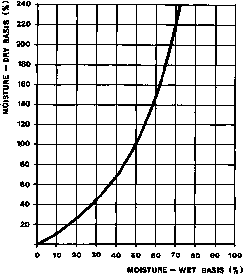 The term moisture indicates the water content in percent of the total weight. That means that moisture is expressed on wet basis, which is the normal way in fuel contests. On the other hand, in common forest industry vocabulary moisture often refers to the ratio between the water content and the dry weight (dry basis). The relationship between wet and dry basis moisture is shown in the following figure.