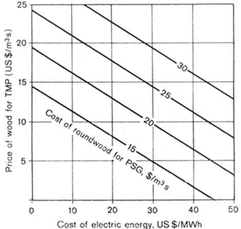 As another example of the interpretation of Figure 1, it could be pointed out that at a power cost of US $50/MWh and a roundwood cost of US $25/m3, the thermomechanical process would have to be supplied with residues at a cost not exceeding US $8/m3 in order to be competitive with the pressurized groundwood process. However, it is doubtful whether newsprint production based on any process would be viable at such a power cost.