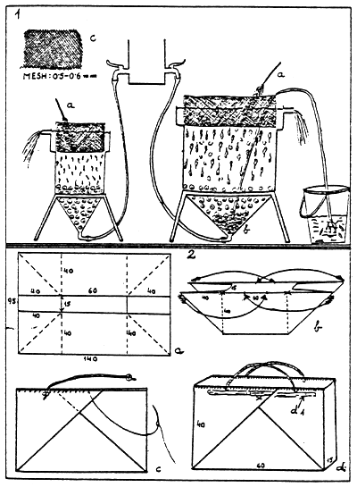 (a) during hatching the screen inlay of the jar has to be often cleaned otherwise the empty shells clog the screen and the water may overflow: (b) when the hatching is finished the debris should be removed by syphoning; (c) the appropriate mesh size of the screen inlay in jars for Chinese carp