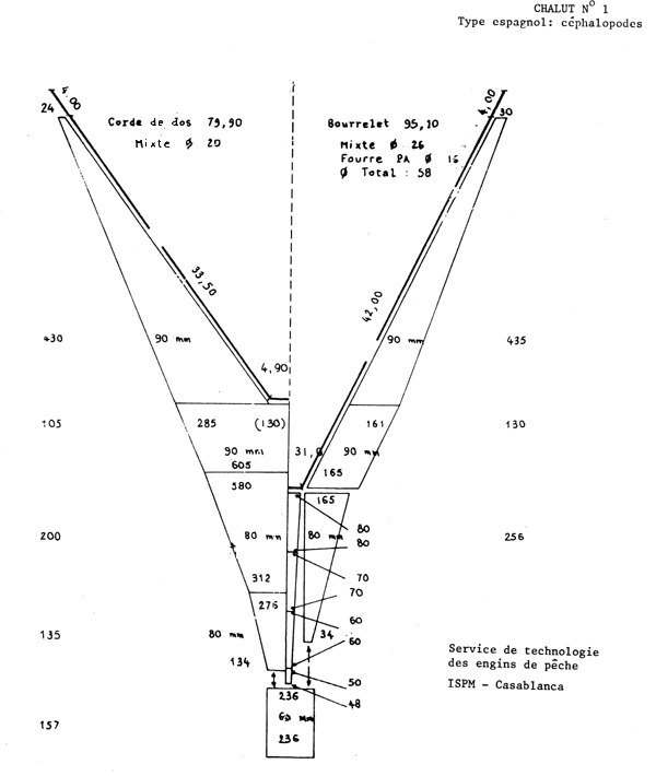 A = 3 traits de chalut avec poche de cou-verture contenant des