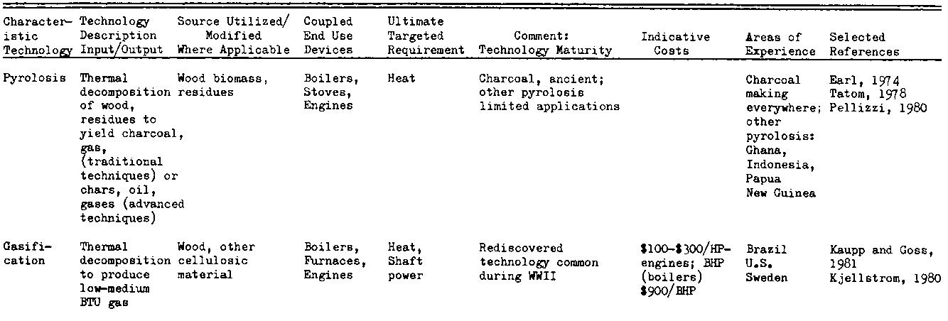 Several conversion technologies using renewable energy sources are being developed which are both complementary to and competitive with fuelwood and charcoal in some of the applications discussed above. Information on the applicability of several old and new energy technologies in specific and uses is summarized in Table IV-4.